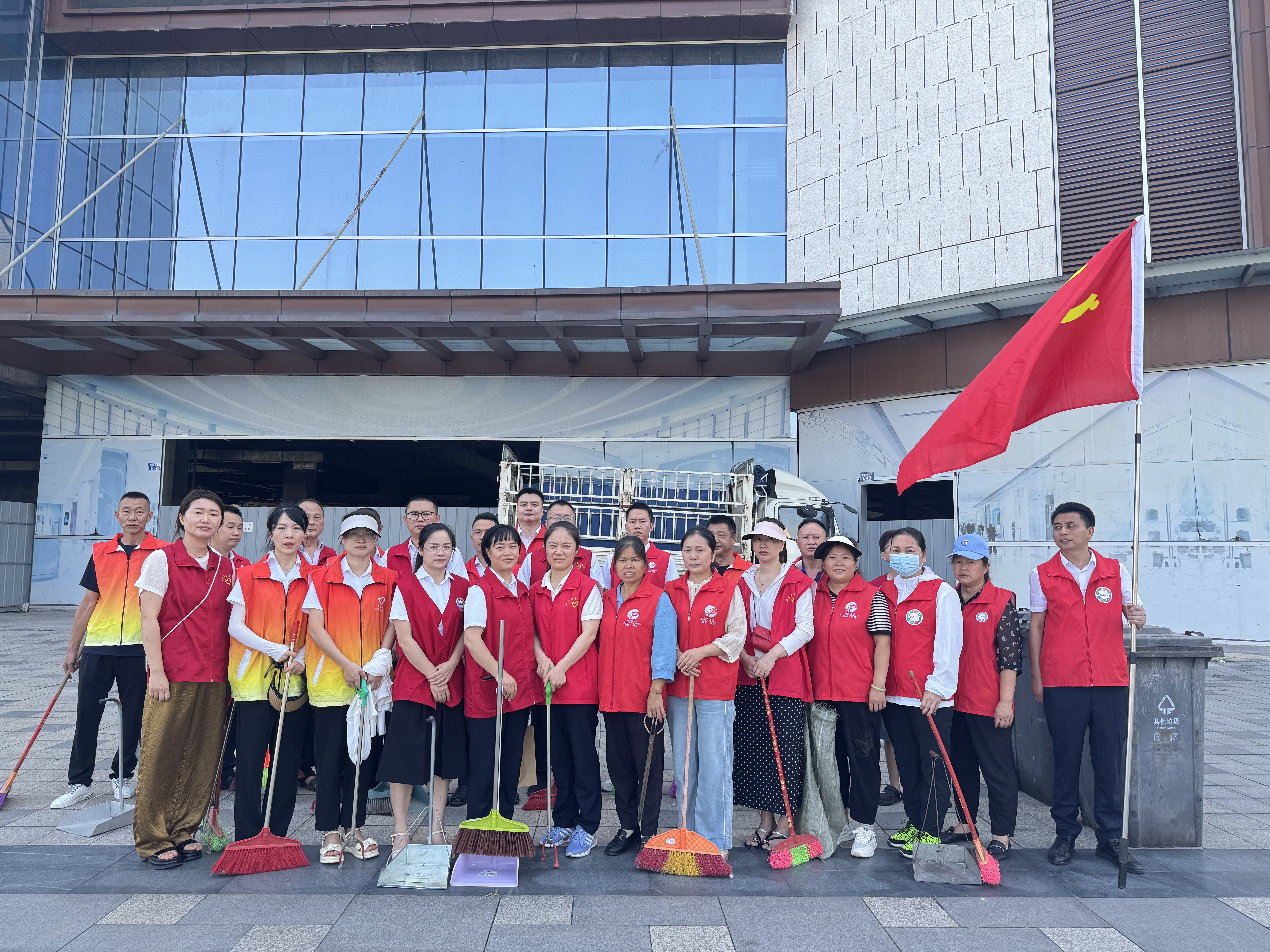 活動伊始,朝陽社區(qū)黨委書記對活動背景與意義進(jìn)行深入闡述,并向匯興集團(tuán)黨員同志的積極響應(yīng)致以誠摯謝意。隨后,全體人員跟隨黨旗,來到打掃區(qū)域。根據(jù)區(qū)域特性分為兩組,一組負(fù)責(zé)友豪商圈外圍環(huán)境清理,另一組專注商圈內(nèi)部清潔工作?;顒又校h員志愿者們手持掃帚、鏟子等工具,仔細(xì)清理路面垃圾、衛(wèi)生死角。經(jīng)過大家的努力,臟亂的友豪商圈內(nèi)部環(huán)境得到有效清理。